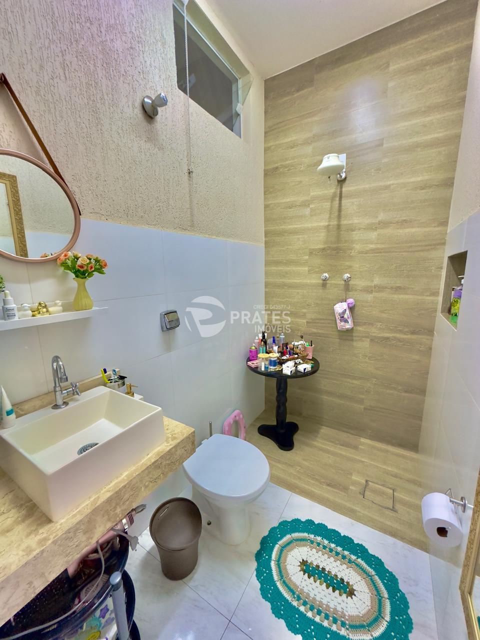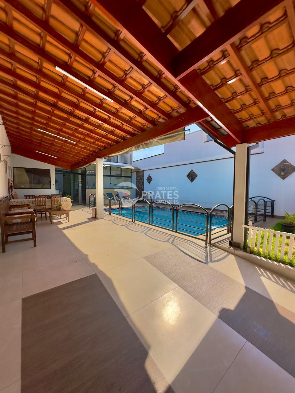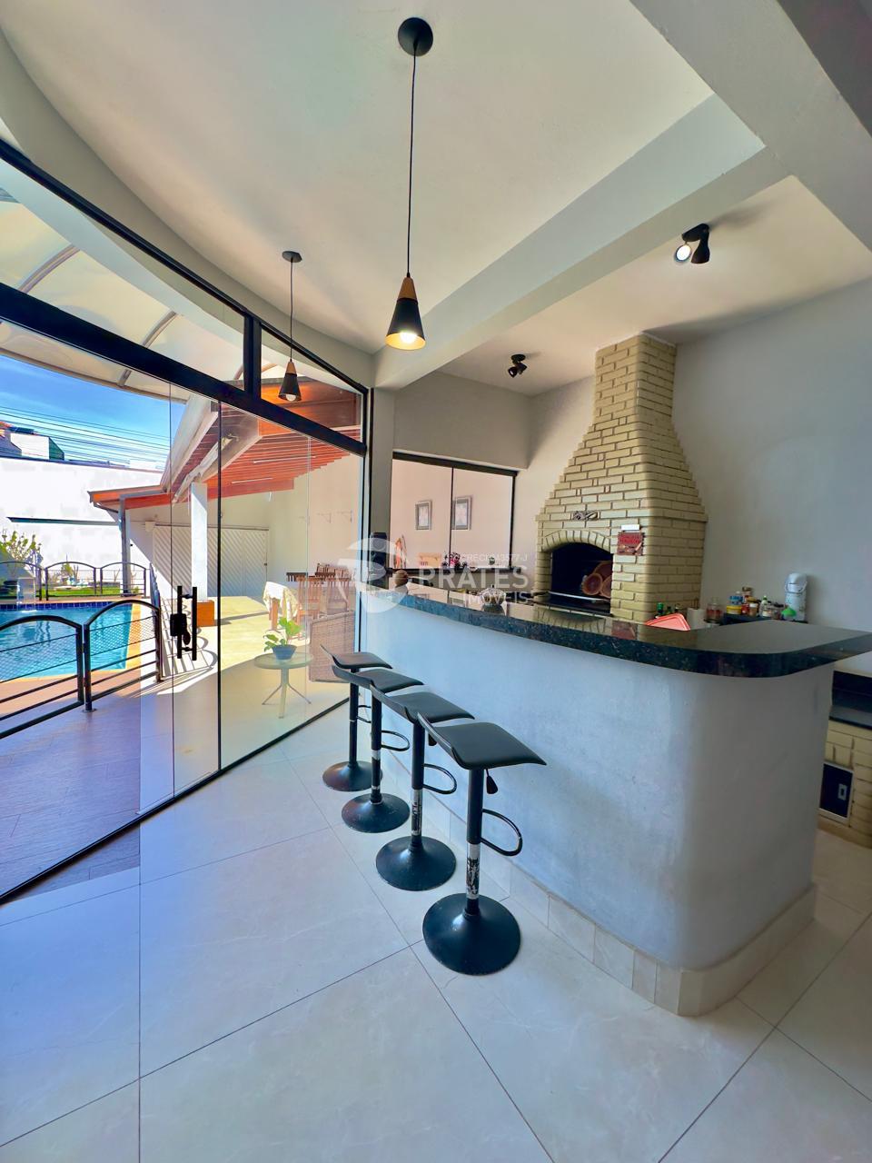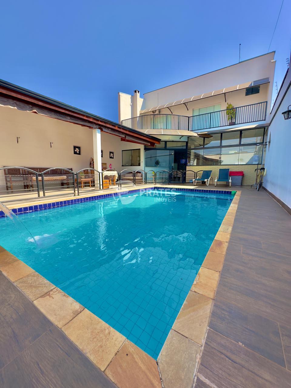 Casa contendo, Piso superior, 2 dormitórios, 1 banheiro, sala com sacada, Piso térreo, sala de tv, cozinha gourmet com churrasqueira e fogão á lenha, piscina com cascata, despensa, 2 banheiros, 2 vagas de garagem.