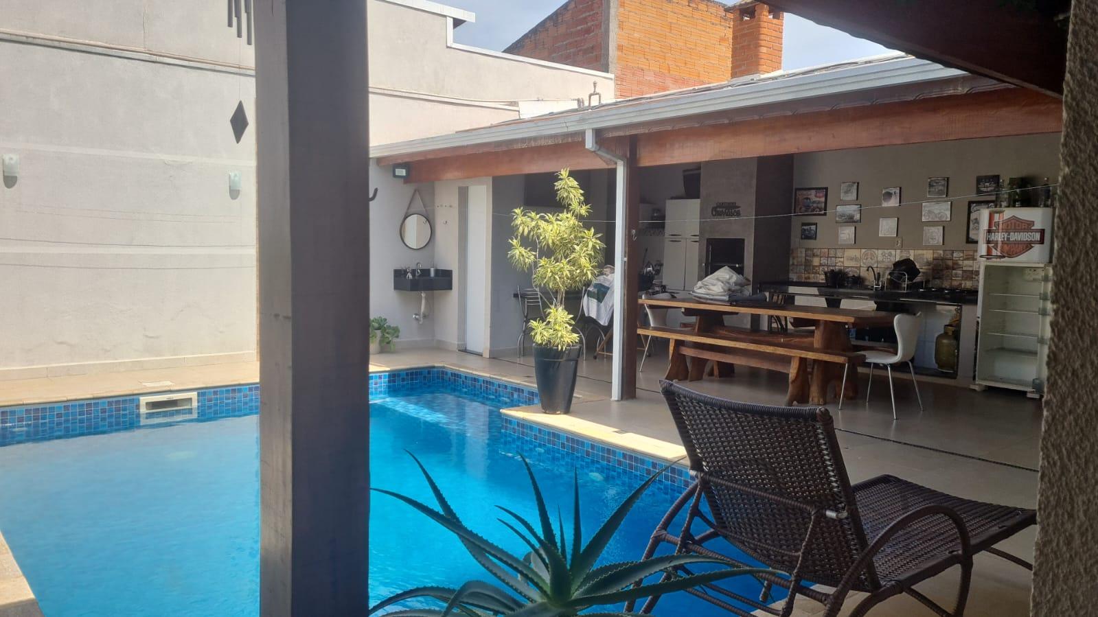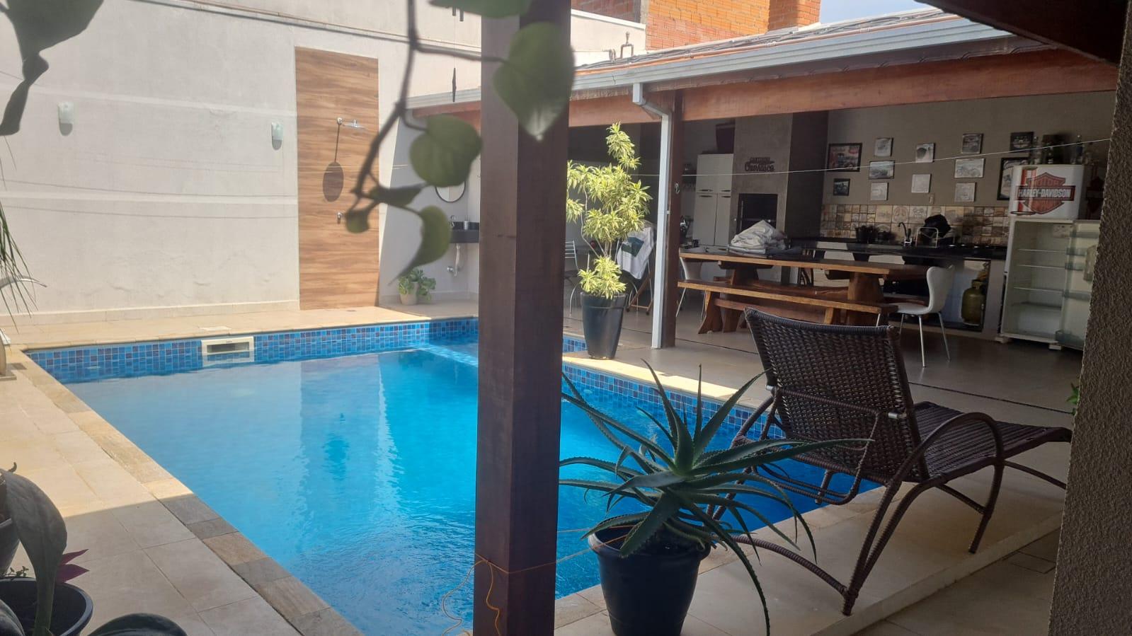 Casa contendo, 2 dormitórios sendo 1 suíte, sala de estar e jantar integradas á cozinha, banheiro social, área de lazer com churrasqueira, piscina, banheiro externo, 2 vagas de garagem.