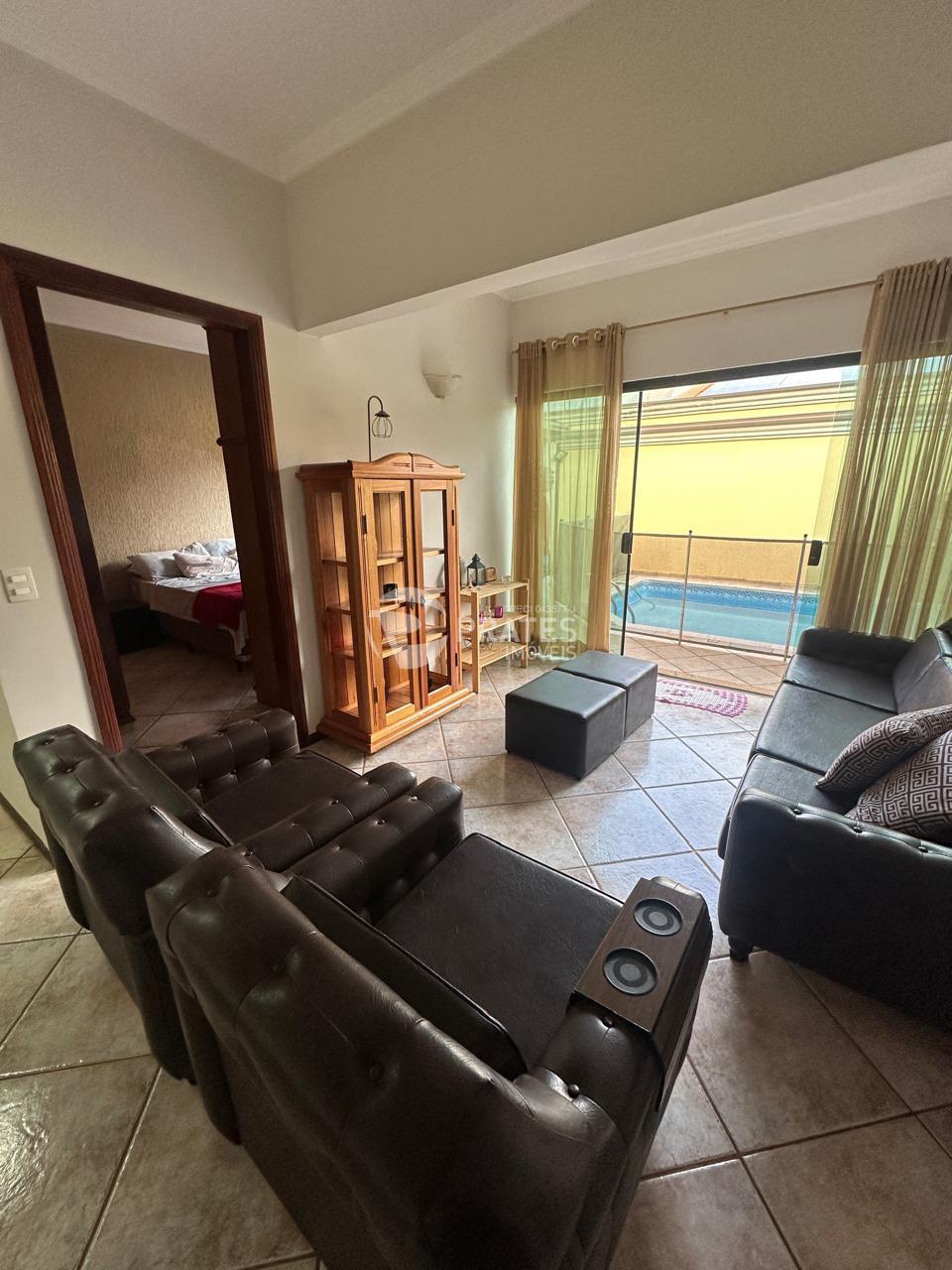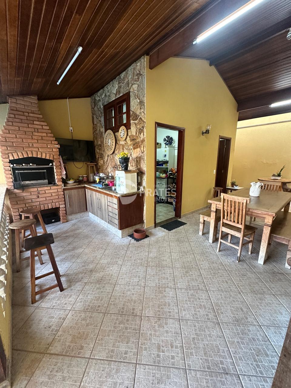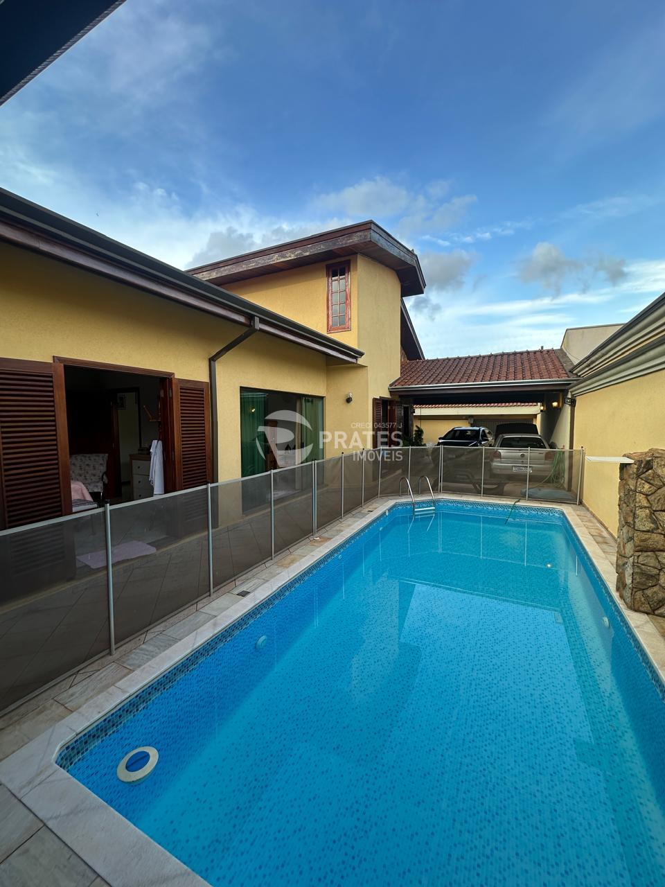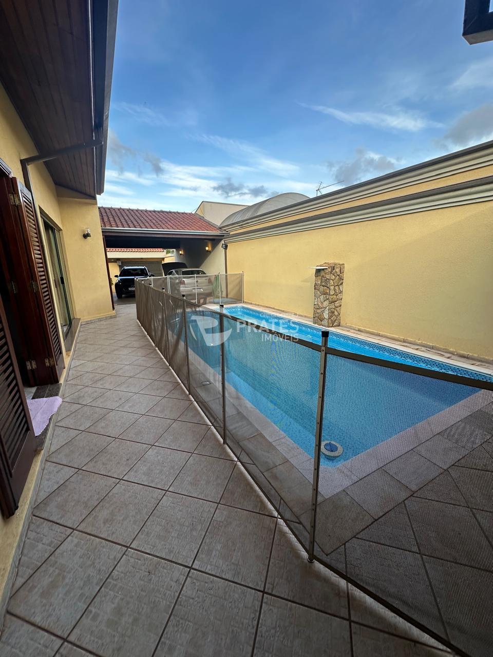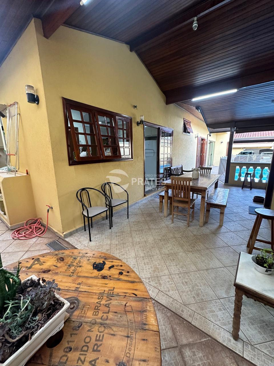 Casa térrea, 3 dormitórios sendo 1 suíte, salas 2 ambientes + mezanino, cozinha integrada, espaço gourmet com piscina e churrasqueira, banheiro externo, 2 vagas