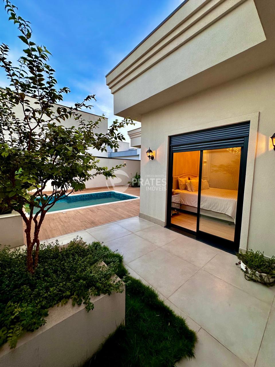 Casa térrea, estilo néoclassico contendo 3 suítes a master com closet, salas para 2 ambientes, lavabo, cozinha integrada com as salas, espaço gourmet, com churrasqueira, piscina, banheiro externo