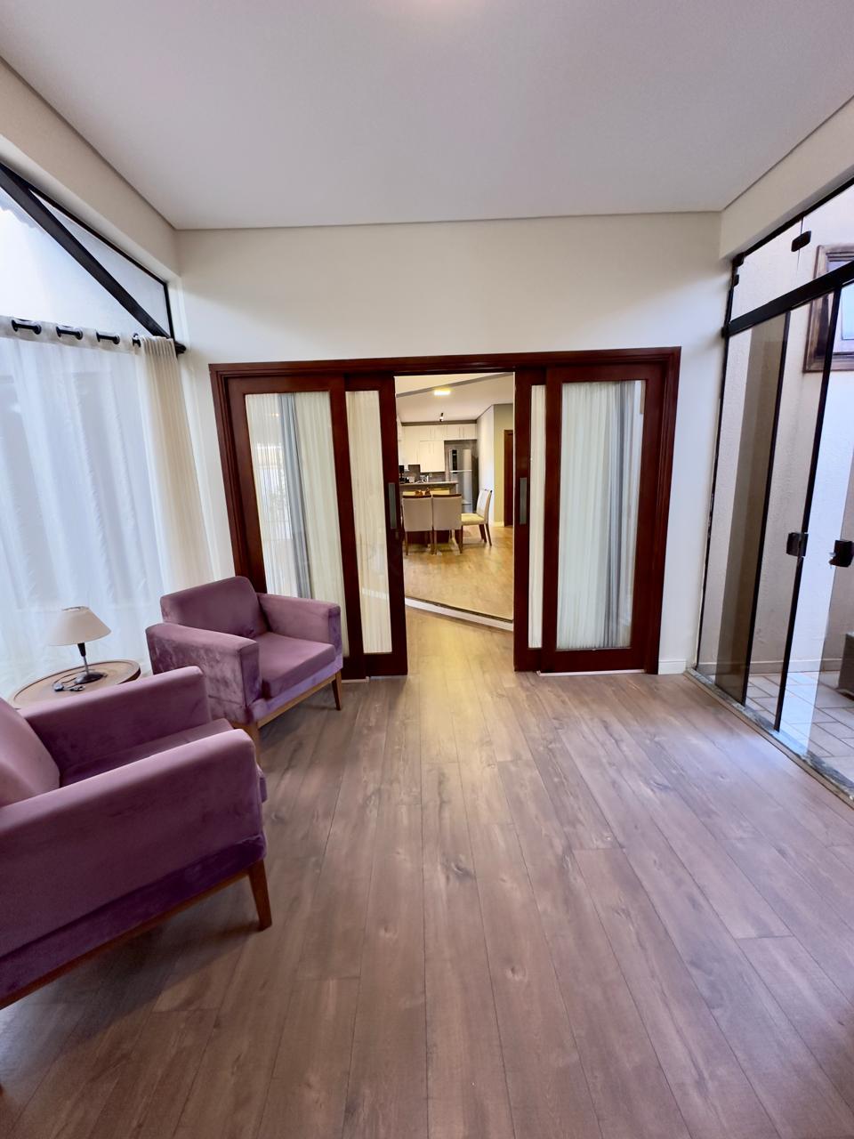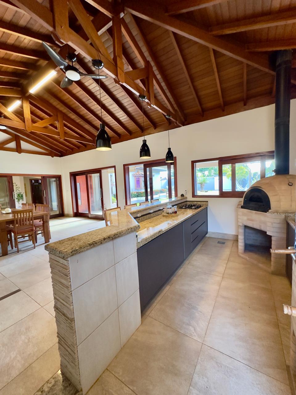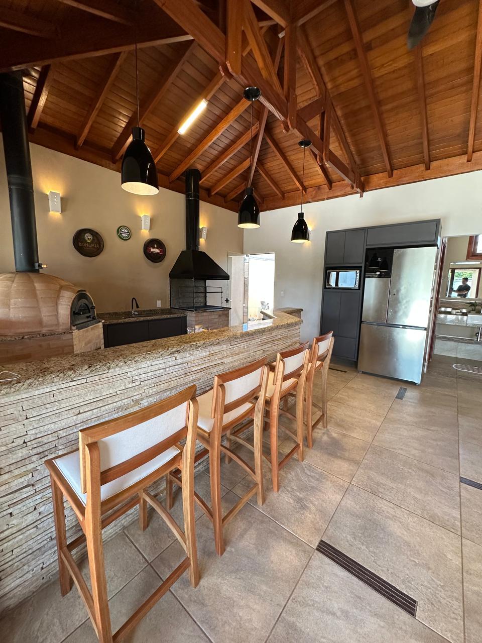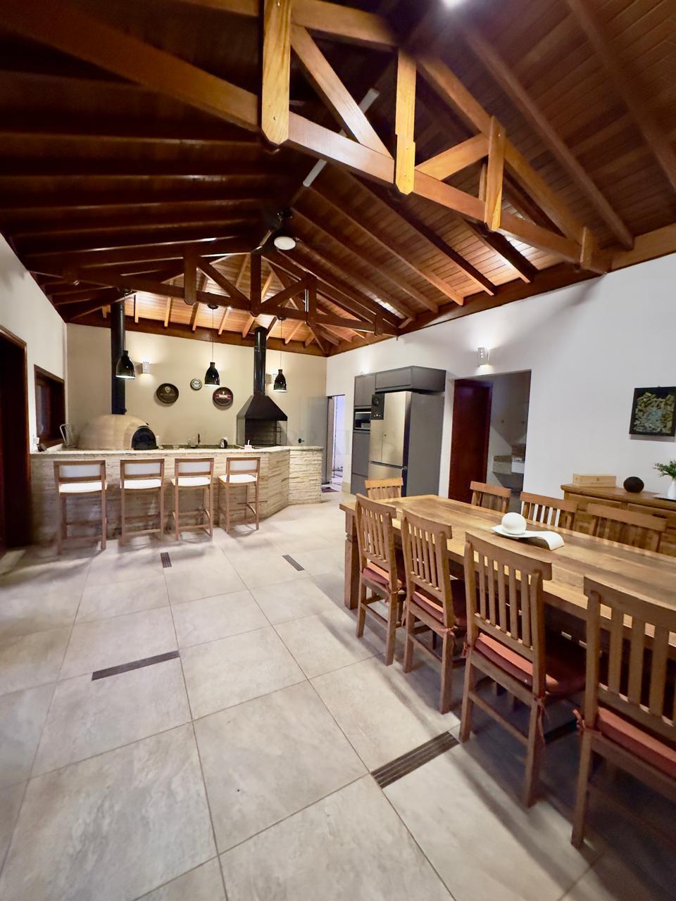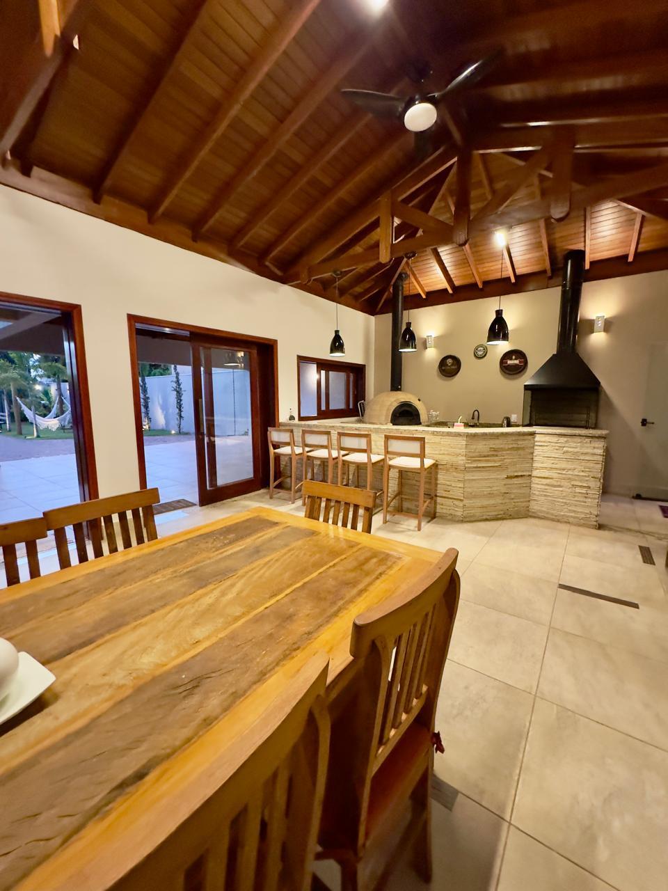 Casa com 3 dormitórios, sendo 2 suítes com closet, salas de tv, jantar, lavabo, cozinha integrada com as salas, espaço gourmet com churrasqueira, forno de pizza, banheiro de apoio, piscina com cascata, rancho de frente para a piscina com mesas, pomar, jardim com pinheiros e palmeira, redário