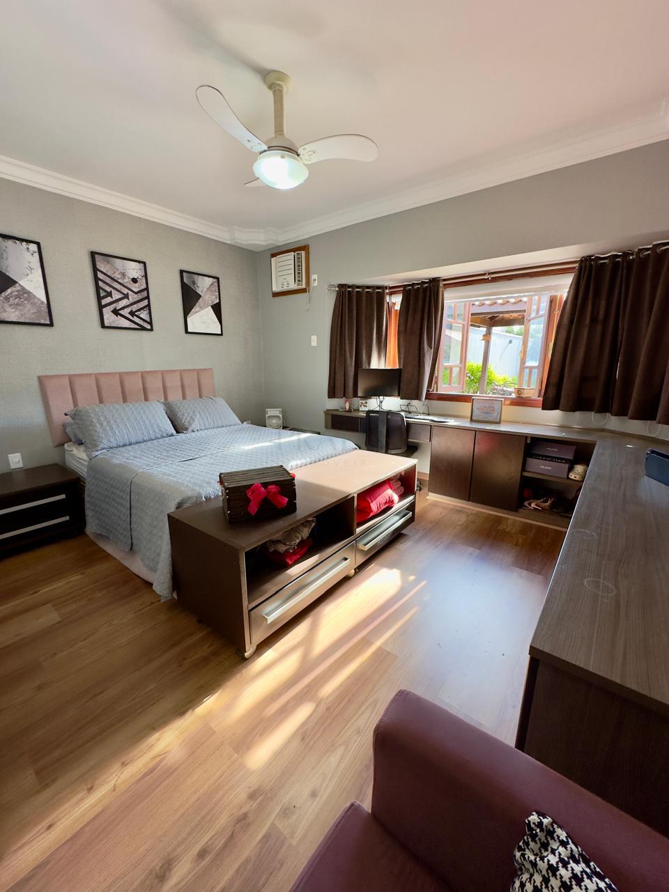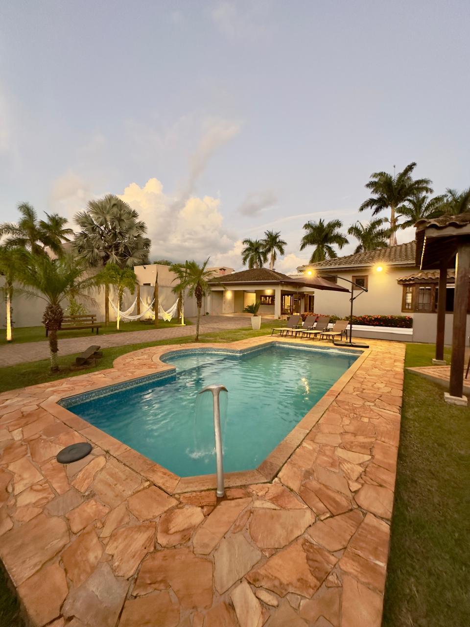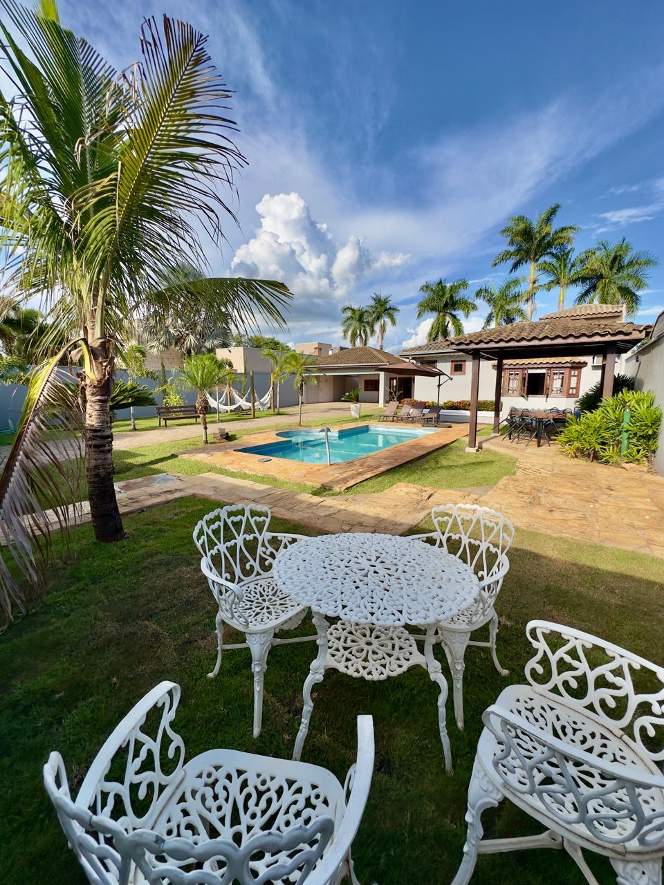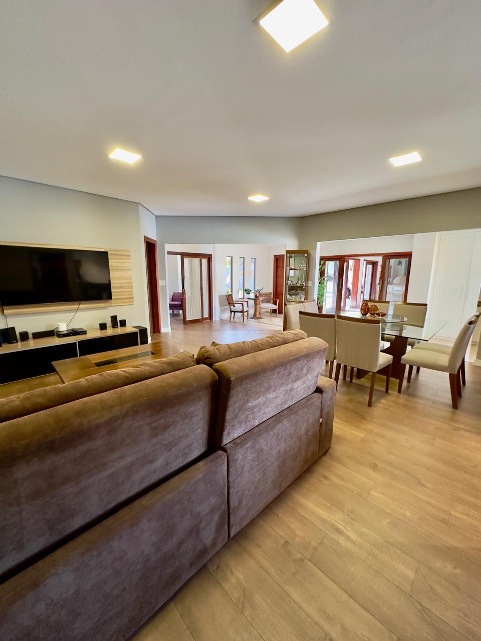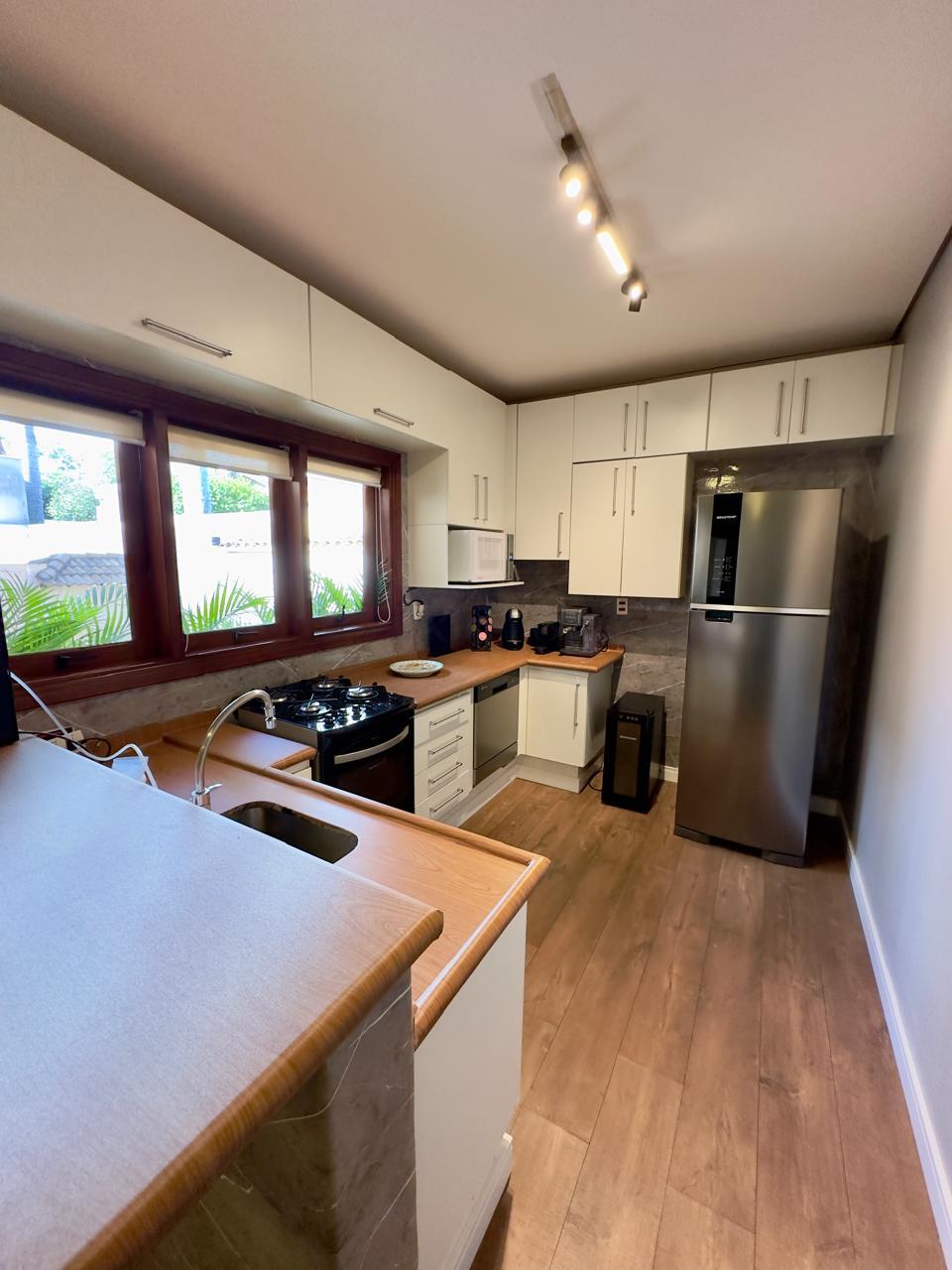 Casa com 3 dormitórios, sendo 2 suítes com closet, salas de tv, jantar, lavabo, cozinha integrada com as salas, espaço gourmet com churrasqueira, forno de pizza, banheiro de apoio, piscina com cascata, rancho de frente para a piscina com mesas, pomar, jardim com pinheiros e palmeira, redário
