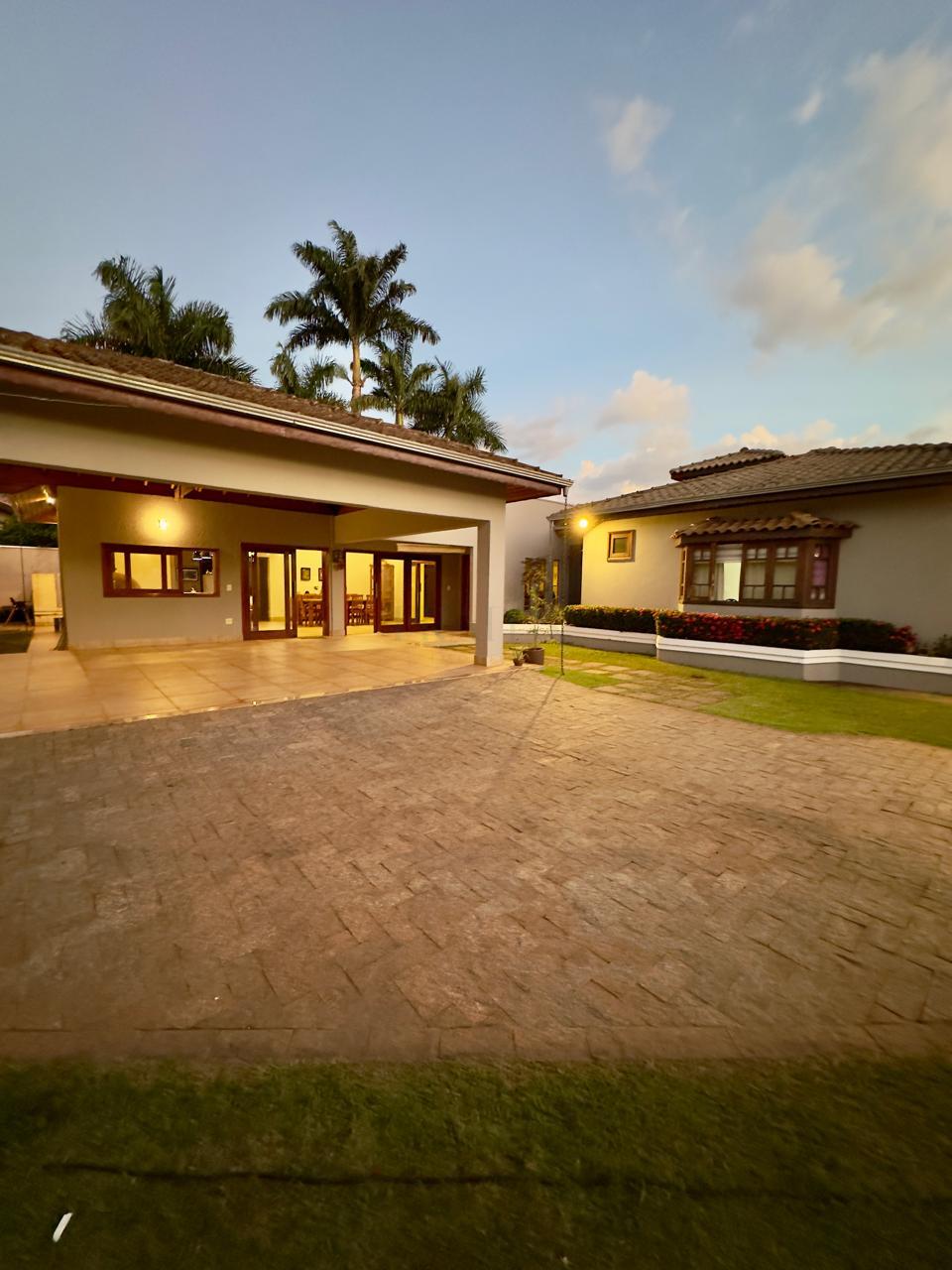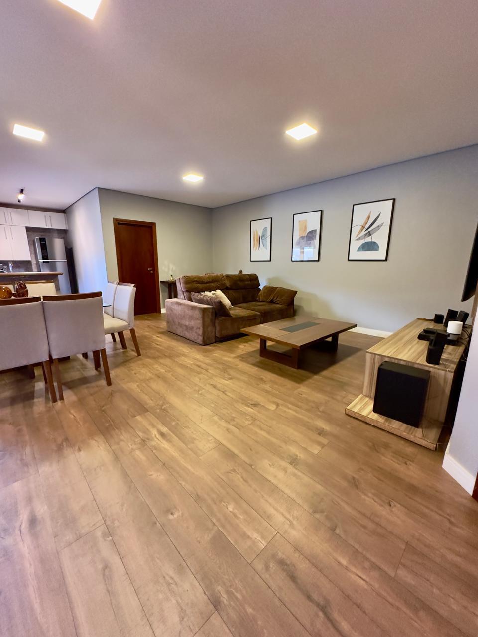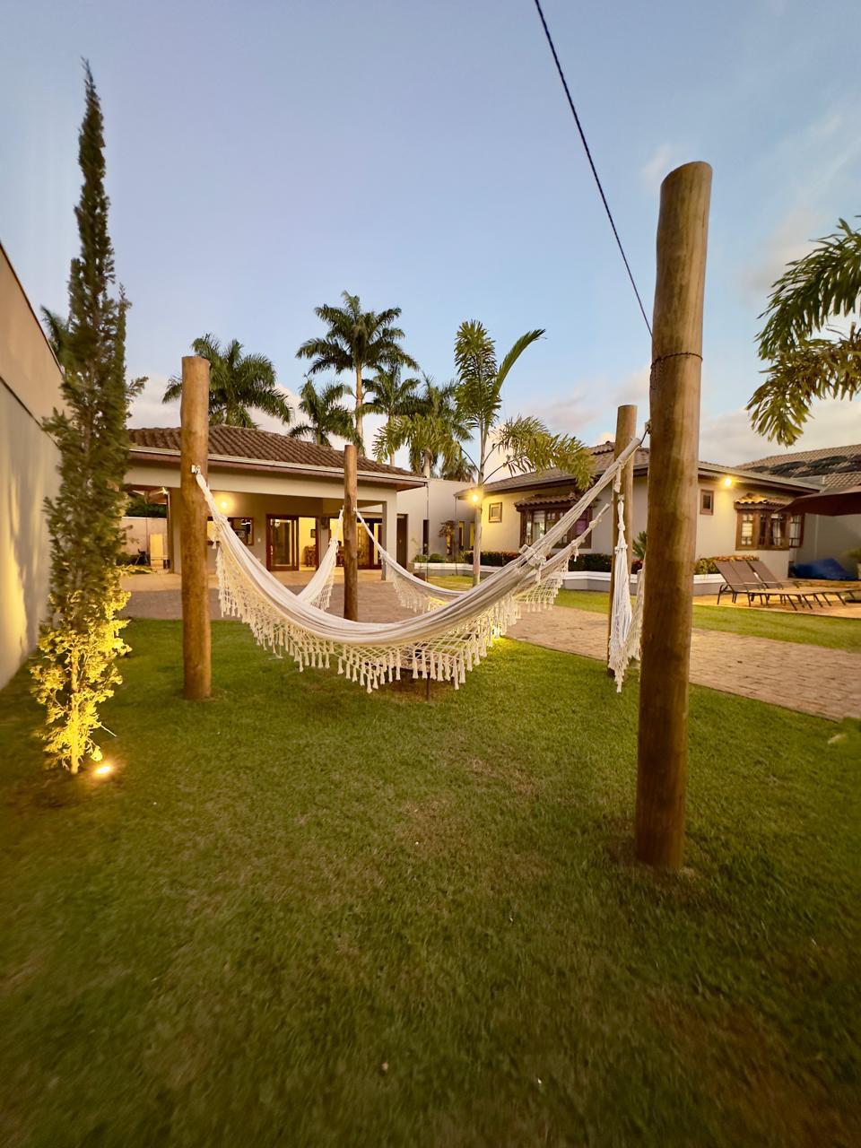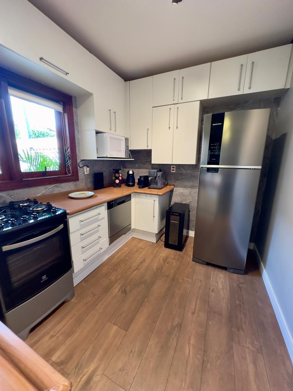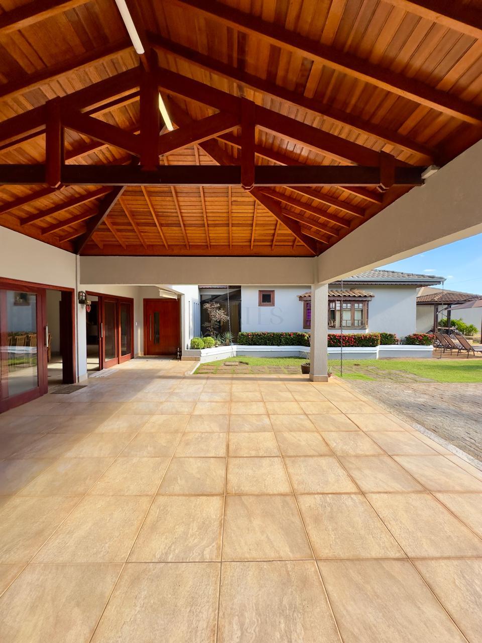 Casa com 3 dormitórios, sendo 2 suítes com closet, salas de tv, jantar, lavabo, cozinha integrada com as salas, espaço gourmet com churrasqueira, forno de pizza, banheiro de apoio, piscina com cascata, rancho de frente para a piscina com mesas, pomar, jardim com pinheiros e palmeira, redário