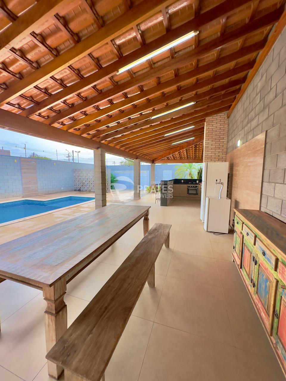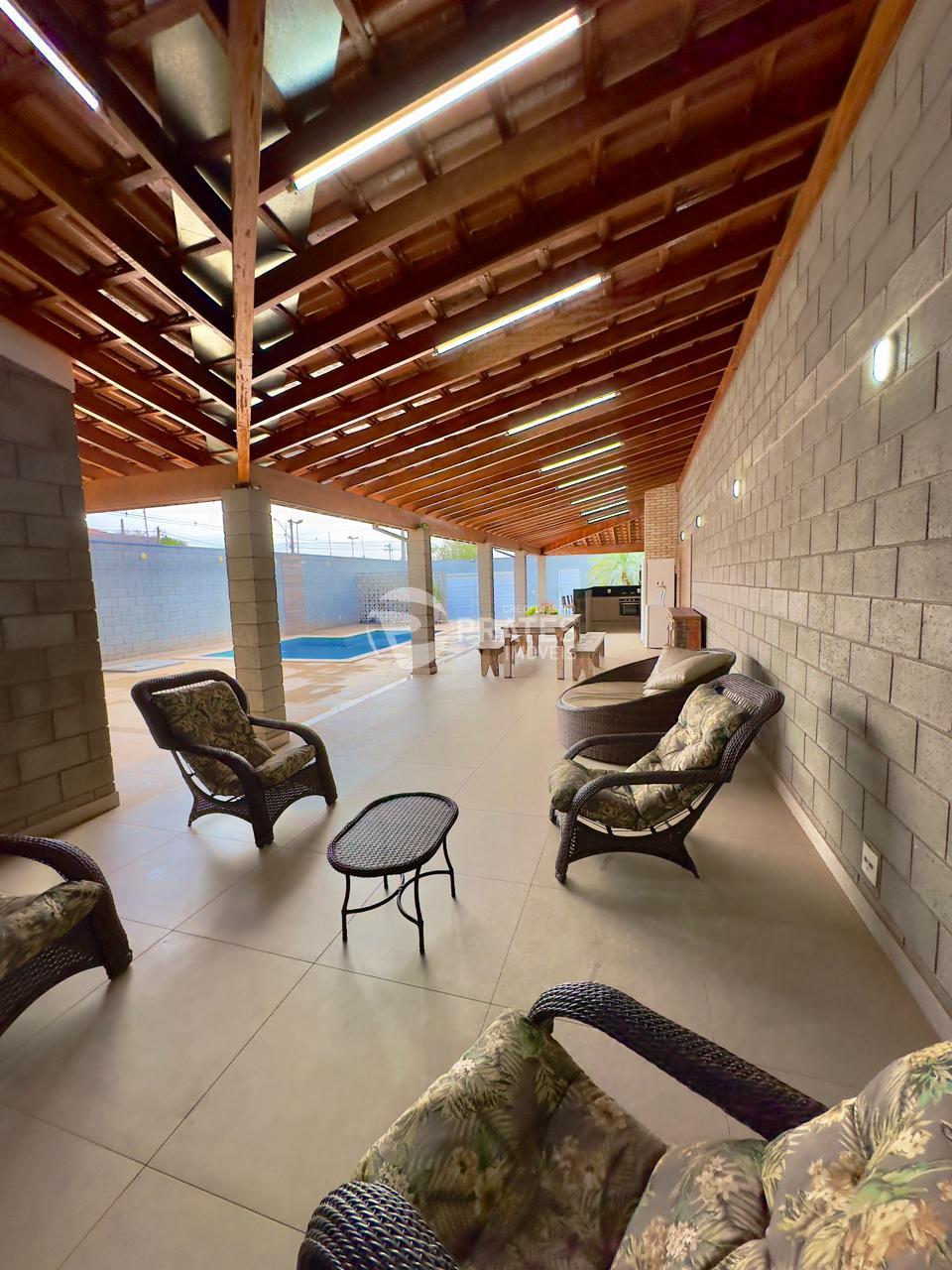 Salão de festas com churrasqueira, pia , armários, piscina com cascata, 2 banheiros externos, 1 quarto